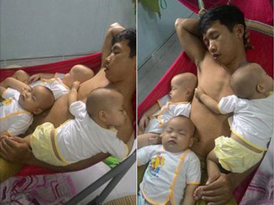 Ông bố một mình "cân" 3 nhóc tì sinh 3, "đánh đu" trên võng mới đáng yêu làm sao