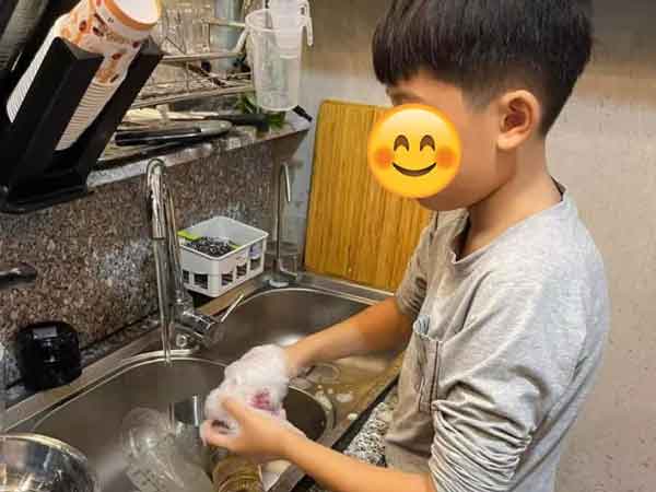 Hình ảnh cậu bé tập trung làm việc bên chiếc bồn rửa ly tách nhận được nhiều lời khen từ dân mạng.