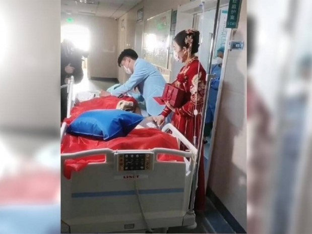 Nhiều cư dân mạng rơi lệ trước cảnh chú rể đưa vợ đến bệnh viện, khấu đầu trước ông lão đang nằm trên giường trong phòng chăm sóc đặc biệt.