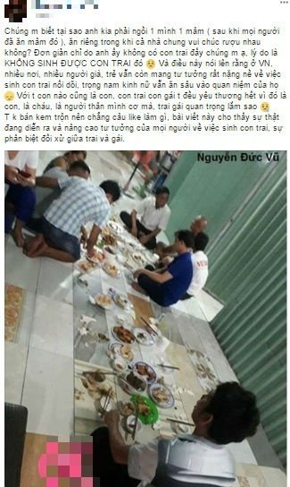 N.Đ.V - chủ nhân bức ảnh đã viết trên Facebook: "Chúng mày biết tại sao anh kia phải ngồi 1 mình 1 mâm (sau khi mọi người đã ăn mâm đó), ăn riêng trong khi cả nhà chung vui chúc rượu nhau không? Đơn giản chỉ do anh ấy không có con trai đấy chúng mày ạ.