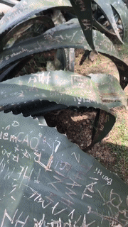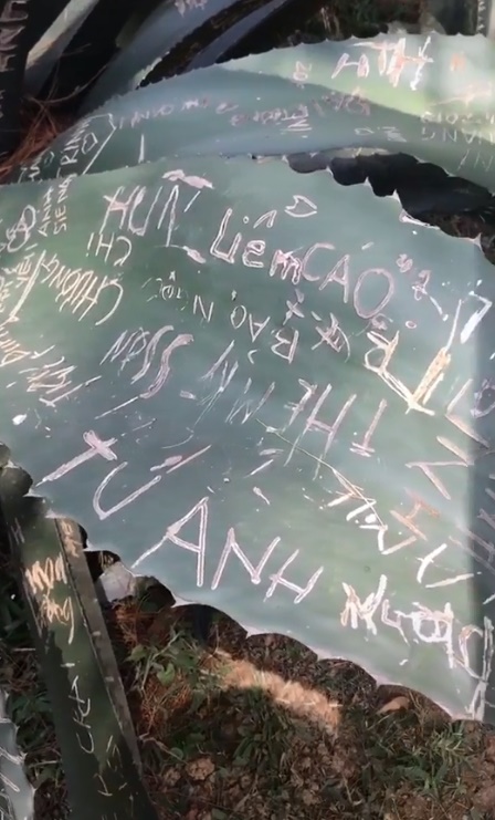 Theo đó, khách du lịch đã không ngại "lưu giữ kỷ niệm" bằng cách ghi đầy số điện thoại, tên tài khoản Facebook, Instagram cá nhân,...thậm chí còn có cả ký hiệu trên lá cây thùa. Trong khi, chẳng có tác dụng gì cho việc chúng ta ghi thông tin cá nhân lên lá một cây kiểng cả!