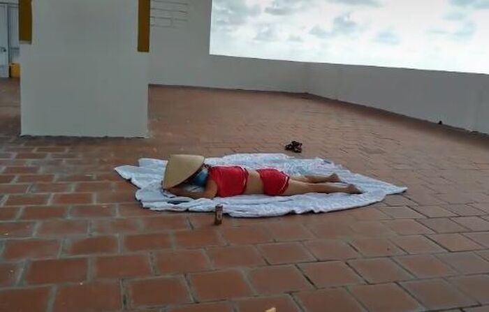 Đoạn video cho thấy, trời đổ nắng rất to nhưng người phụ nữ được cho là F0 lại mang thảm trải ra giữa sân thượng. Chị ta nằm sấp xuống, vén quần áo lên cao, để lộ cả tấm lưng trần, dùng nón che mặt rồi thản nhiên nằm phơi nắng. Bên cạnh còn có một lon nước giải khát để uống phòng khi khát.