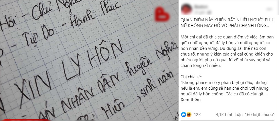 Mới đây, một chị gái đã chia sẻ quan điểm về việc làm bạn giữa những người đã ly hôn và những người có hôn nhân bền vững. Dù đúng sai thế nào còn chưa rõ, nhưng ý kiến của chị gái cũng khiến cho nhiều người phụ nữ qua đổ vỡ phải suy nghĩ và chạnh lòng rất nhiều.