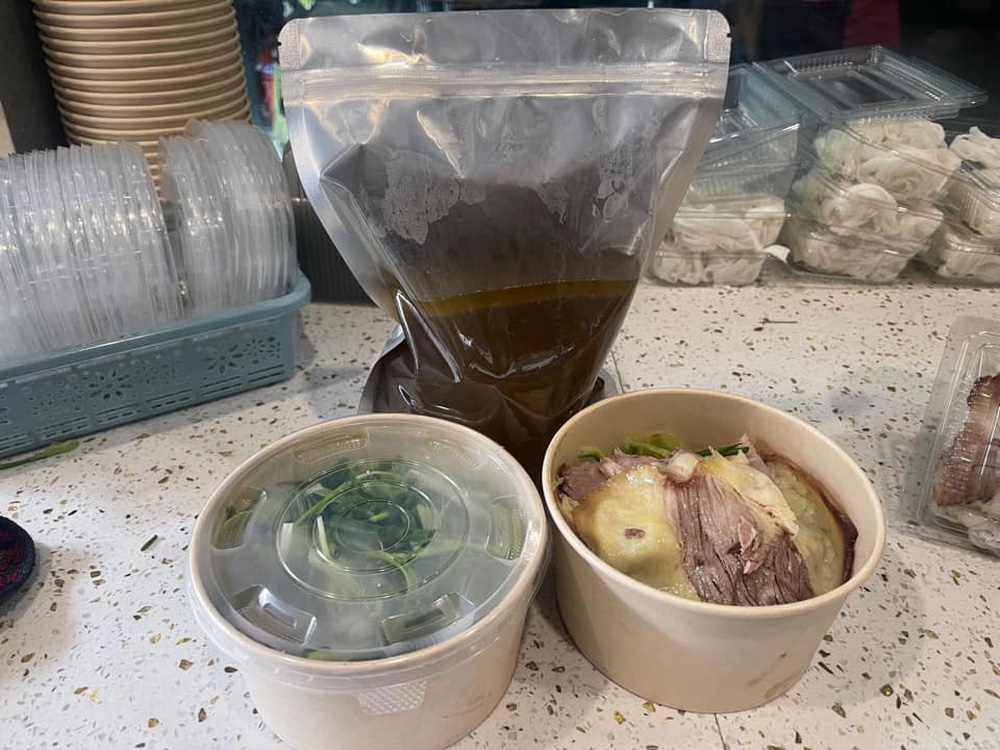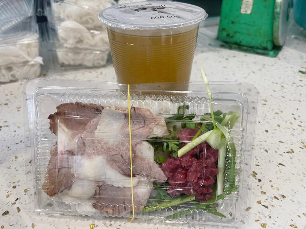 Trên thực tế, quán có 2 combo, 2 hình thức bán phở online là lạnh và nóng. Với combo nóng, quán sẽ kèm thìa đũa, đóng nước trong túi zip bạc, phở và thịt chần sẵn, đựng trong bát giấy. Phần đóng gói này sẽ tính thêm phí bao bì.