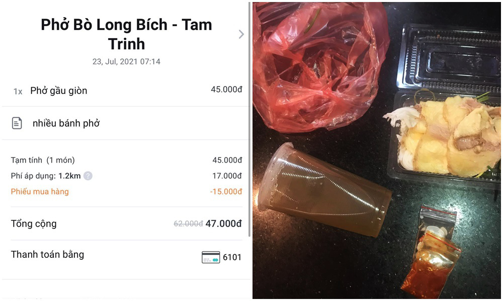 N.H.S viết: "Thật tuyệt khi bát phở bò giao đến cho mình được đóng gói như trên. Chuyện sẽ chẳng có gì nếu mình kiểm tra thì suất phở giao cho mình có một ly nước dùng nguội lạnh và không hề có đũa thìa".