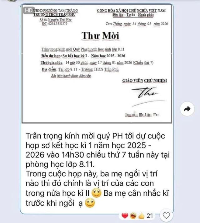 Theo phản ánh, giáo viên chủ nhiệm mời phụ huynh họp sơ kết học kỳ I năm học 2025-2026 vào lúc 14 giờ 30. Tuy nhiên, trong tin nhắn gửi đến nhóm phụ huynh, giáo viên kèm theo lưu ý rằng phụ huynh ngồi ở vị trí nào trong buổi họp thì con em sẽ ngồi đúng vị trí đó trong nửa học kỳ II.