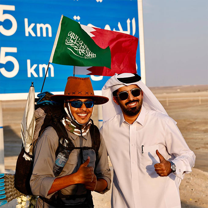 Abdullah Al Sulmi, 33 tuổi, một phượt thủ dày dạn kinh nghiệm, đã đến Doha vào thứ Hai vừa qua sau 55 ngày di chuyển từ Jeddah (Saudi Arabia). Tất cả những gì anh ấy mang theo là ba lô, cột trekking cùng lá cờ Saudi Arabia và Qatar.