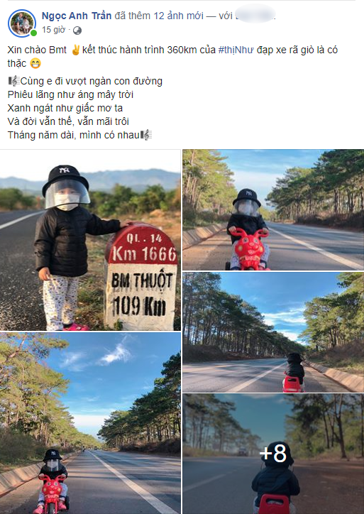 Người chia sẻ những hình ảnh này là chị Trần Ngọc Anh - mẹ của bé. Chị hài hước viết: "Xin chào Buôn Mê Thuột. Kết thúc hành trình 360 km của Thị Như. Đạp xe rã giò là có thật ạ".