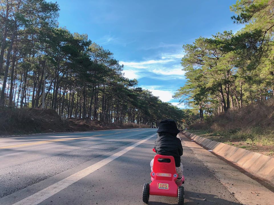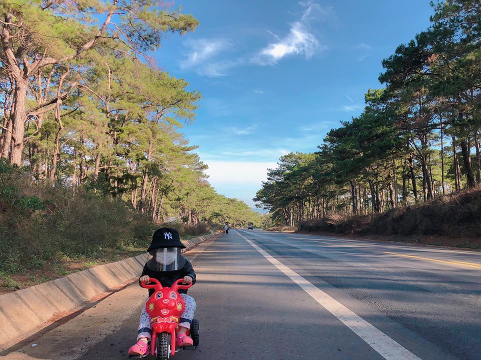Mình chỉ tính dừng chân nghỉ thì cho bé chụp ảnh kỉ niệm chỗ cột mốc Buôn Ma Thuột thôi, ai ngờ bé đòi đi chiếc xe yêu thích của mình để trải nghiệm. Thế là tụi mình cũng chiều theo ý con.