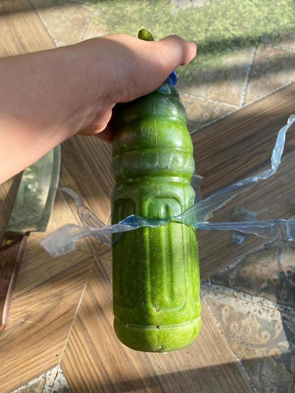 Họ cắt quả bí vào nhà rồi bắt đầu cắt lớp chai xung quanh ra. Để rồi cuối cùng, một quả bí đao hình cái chai xuất hiện rồi.
