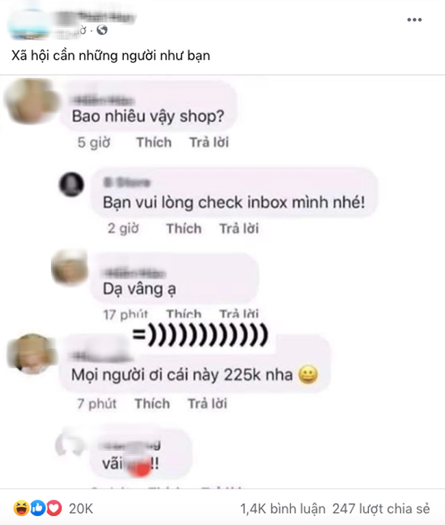 - "Ha ha. Trước cũng kiểu ức chế vụ này á, sao không công khai giá luôn mà cứ inbox, nhưng có vài đứa bạn cũng bán online á hỏi chúng nó, chúng nó bảo là up kèm giá thì không ai mua. Trời đất, mình nghĩ bán bao nhiêu thì đưa thẳng giá ra, "thuận mua vừa bán" lại đỡ lòng vòng mất thời gian của nhau".