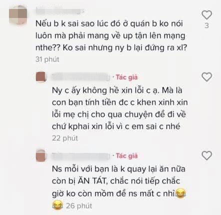 Dưới bài "bóc phốt", tài khoản tự nhận là con gái của chủ quán không phủ nhận chuyện tát khách, đồng thời chỉ trích vị khách đang dẫn câu chuyện một chiều và cố ý nhắm vào quán nhà mình.