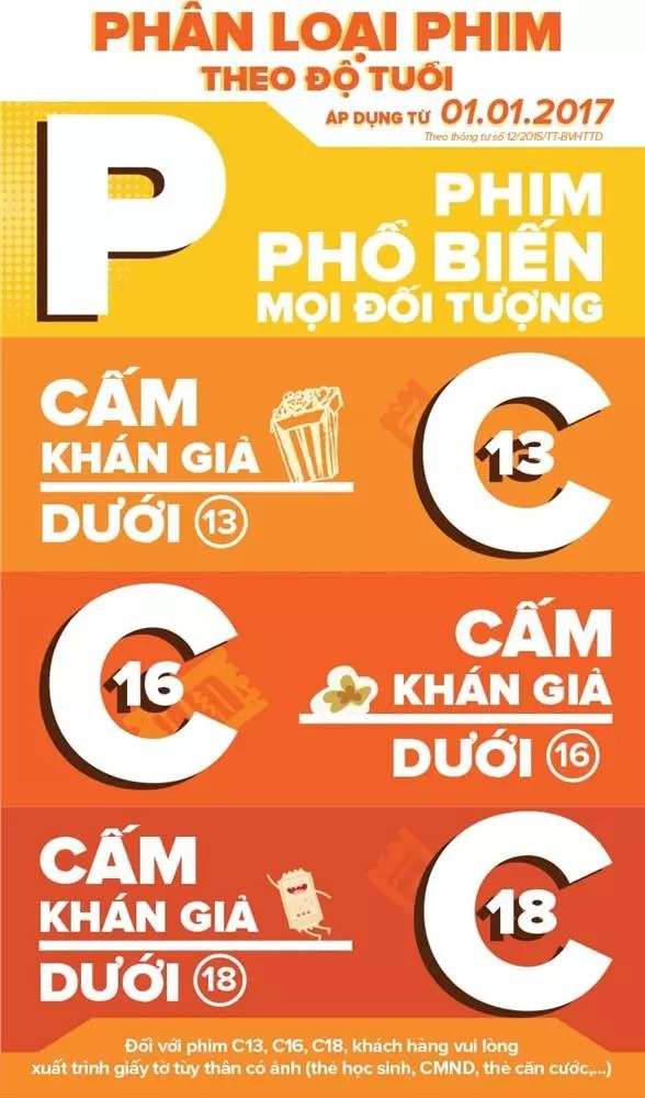 Rạp từng thông báo phân biệt các ký hiệu phân loại độ tuổi xem phim và yêu cầu khách hàng xuất trình giấy tờ tùy thân khi mua vé.