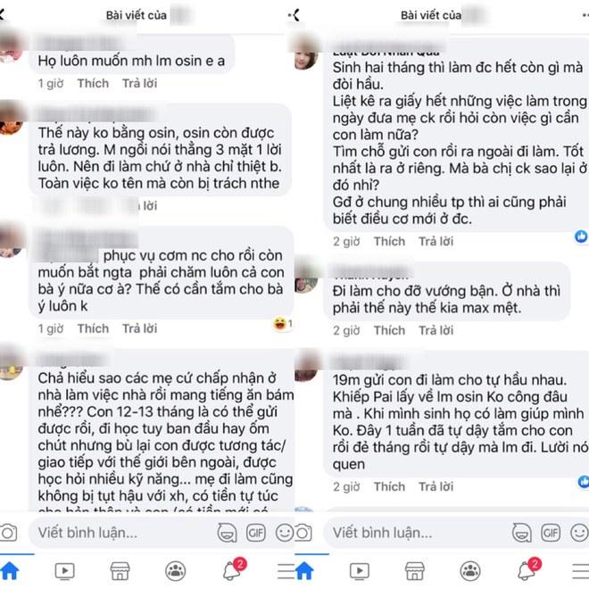 Chị Ngọc Lan nói: "Chả hiểu sao các mẹ cứ chấp nhận ở nhà làm việc nhà rồi mang tiếng ăn bám. Con 12-13 tháng là có thể gửi được rồi, đi học tuy ban đầu hay ốm chút nhưng bù lại con được tương tác/giao tiếp với thế giới bên ngoài, được học hỏi nhiều kỹ năng...