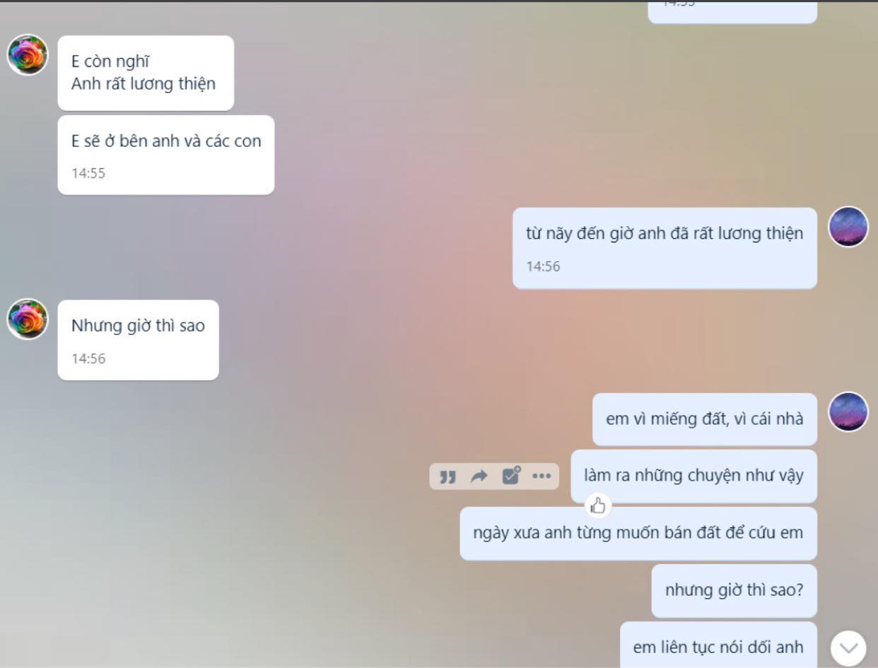 Ấy vậy mà, biến cố một lần nữa lại xảy ra trong gia đình mình chỉ 1 năm rưỡi sau đó, phá tan hết tất cả. Một cặp vợ chồng gọi là chị H., khách VIP của tiệm vàng mà vợ mình làm tư vấn viên. Vì là khách VIP nên vợ mình hay gửi mẫu qua Zalo chị vợ. Không hiểu sao ông chồng lại lấy xài, trò chuyện qua lại, rồi tặng vàng, kim cương, mua xe SH Mode, thậm chí mua đất cho để rồi quan hệ ngoài luồng với vợ mình!