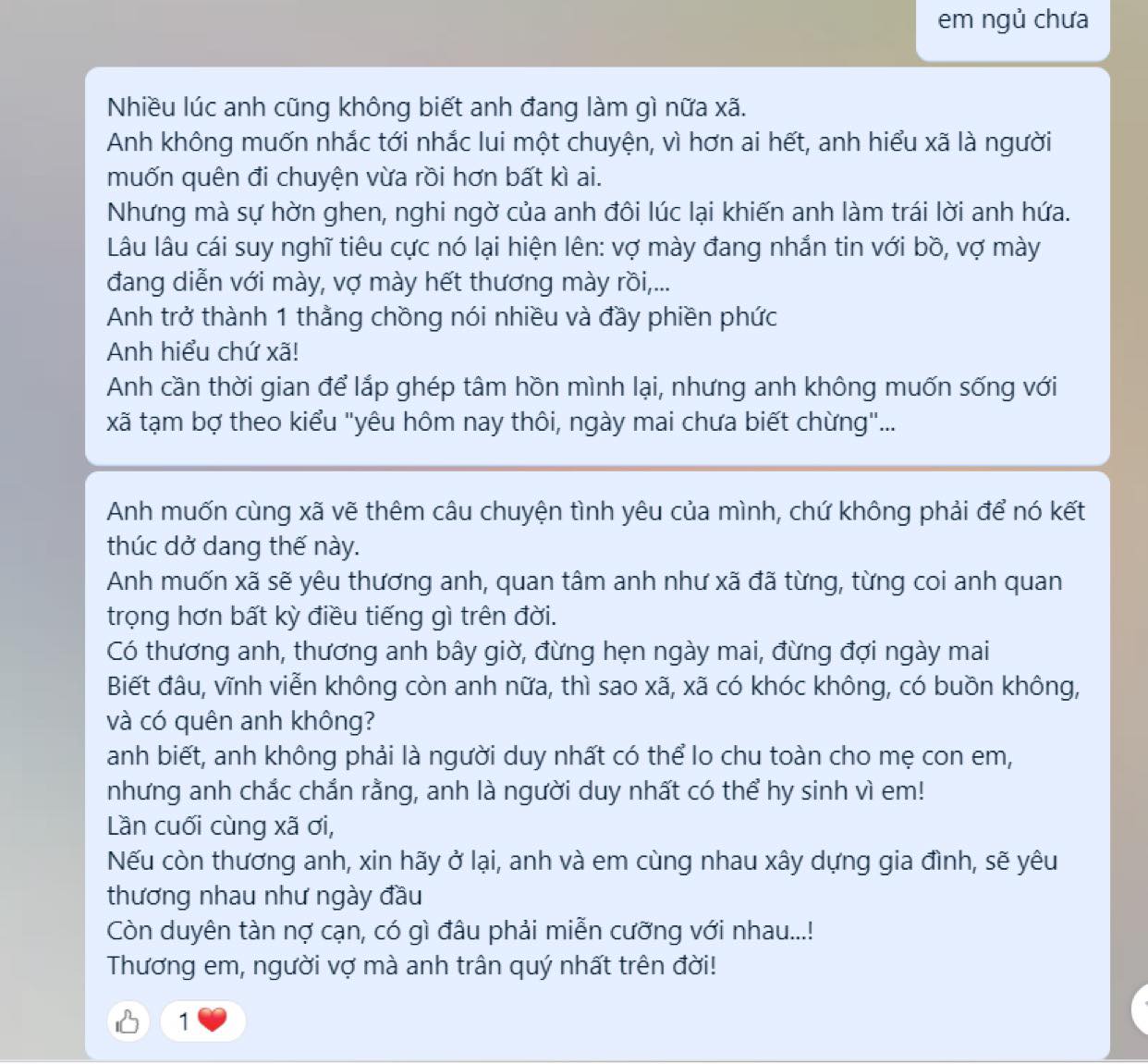 Đọc tin nhắn mà như rụng rời tay chân, nhưng vì gia đình, vì con nhỏ nên mình vẫn nhẫn nhịn bình tĩnh nói chuyện với vợ. Nhưng vợ thì nhất quyết từ chối sự tha thứ và muốn li dị với mình nhanh nhất có thể. Đã muốn thứ tha để bắt đầu lại, nhưng vẫn không biết đường về nên mình đã nặng tay với vợ vợ mình, nhưng thay vì tỉnh ngộ, đó là lý do mà vợ lại càng quyết li hôn, thậm chí, bỏ cả con.