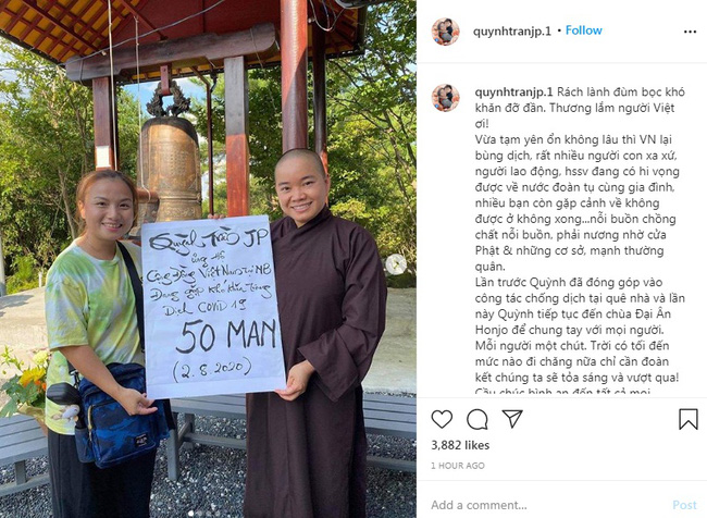 Cụ thể, Quỳnh Trần JP viết: "Rách lành đùm bọc khó khăn đỡ đần. Thương lắm người Việt ơi! Vừa tạm yên ổn không lâu thì Việt Nam lại bùng dịch, rất nhiều người con xa xứ, người lao động, học sinh sinh viên đang có hi vọng được về nước đoàn tụ cùng gia đình, nhiều bạn còn gặp cảnh về không được ở không xong, nỗi buồn chồng chất nỗi buồn, phải nương nhờ cửa Phật & những cơ sở, mạnh thường quân. Lần trước Quỳnh đã đóng góp vào công tác chống dịch tại quê nhà và lần này Quỳnh tiếp tục đến chùa Đại Ân Honjo để chung tay với mọi người. Mỗi người một chút. Trời có tối đến mức nào đi chăng nữa chỉ cần đoàn kết chúng ta sẽ tỏa sáng và vượt qua! Cầu chúc bình an đến tất cả mọi người! Cám ơn cô Thích Tâm Trí và chùa Đại Ân Honjo đã hỗ trợ các bạn, mọi người share giúp thông tin này để có nhiều mạnh thường quân biết đến nhé. Xin cám ơn!".