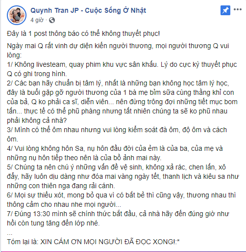 Để buổi gặp được trọn vẹn, Quỳnh Trần liên tục dặn dò mọi người những điều cần lưu ý. Mới đây nhất, trước giờ G, bà mẹ bỉm sữa này lại tiếp tục ra “tối hậu thư” với rất nhiều quy định.