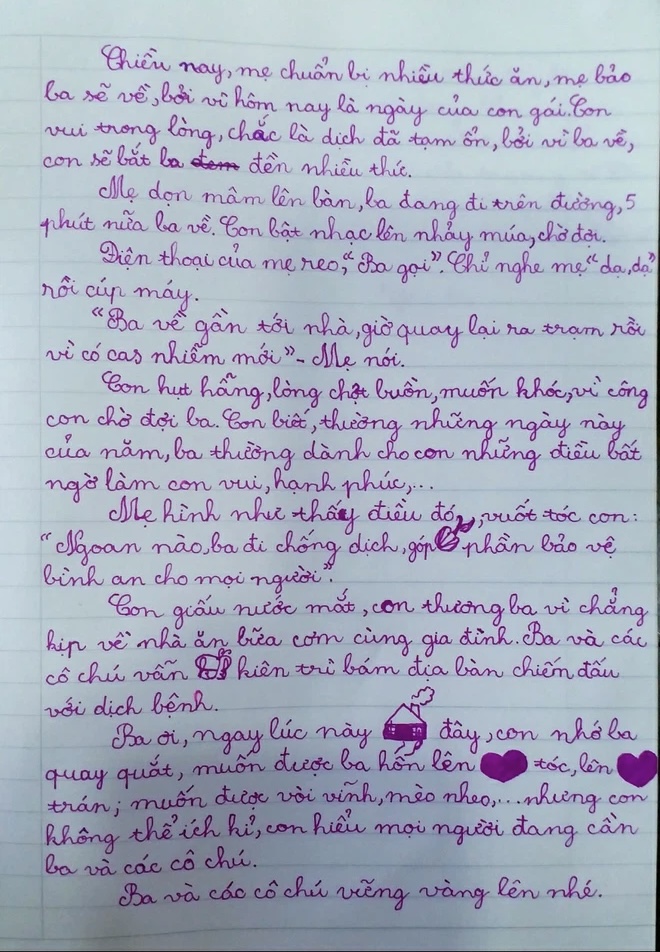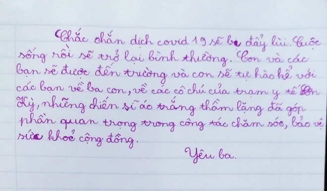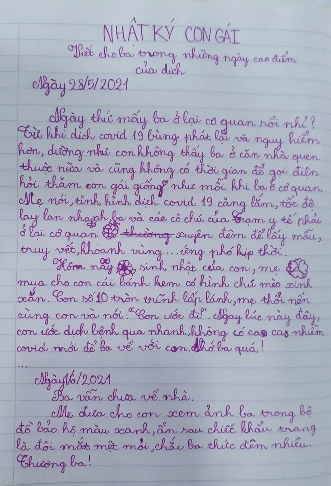 "Ngày 28/5/2021 Ngày thứ mấy ba ở lại cơ quan rồi nhỉ? Từ khi dịch Covid-19 bùng phát lại và nguy hiểm hơn, dường như con không thấy ba ở căn nhà quen thuộc nữa và cũng không có thời gian để gọi điện hỏi thăm con gái giống như mỗi khi ba ở cơ quan. Mẹ nói, tình hình dịch Covid-19 căng lắm, tốc độ lây lan nhanh, ba và các cô chú của Trạm y tế phải ở lại cơ quan xuyên đêm để lấy mẫu, truy vết, khoanh vùng … ứng phó kịp thời.