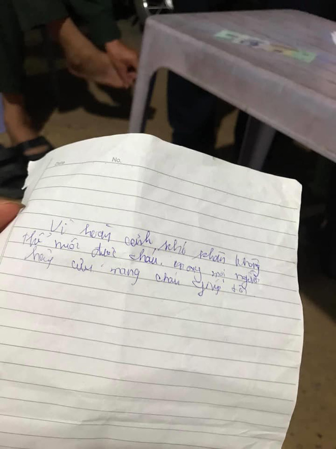 Lúc phát hiện thì em bé được đặt cẩn thận trong nhiều chăn và tã lót. Ngoài vài tờ tiền mẹ em để lại thì còn có một mẩu giấy viết vội: "Vì hoàn cảnh khó khăn không thể nuôi được cháu. Mong mọi người hãy cưu mang cháu giúp tôi".
