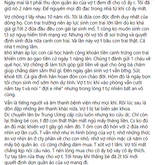 Sau đó cô ấy được chuyển gấp lên bệnh viện tuyến Trung Ương để cấp cứu, nhưng không cứu được, chỉ còn lại thằng bé con. Mình đỡ con, thất thần mất ngủ mấy tháng liền. Cuộc sống không đủ ăn, đủ mặc khiến vợ mình gầy gò nằm đó. Mình ôm con đỏ hỏn với 2 đứa con nhỏ nhìn vợ lần cuối. Mình vẫn nhớ như in hình bóng của vợ mình, nhớ những thức ăn vợ nhịn ăn ở công ty về phần cho con nhỏ. Nhớ vợ mình nhịn mặc cả năm, chỉ có vài bộ quần áo cũ, chẳng dám mua sắm gì. Mình xót vợ mình lắm.