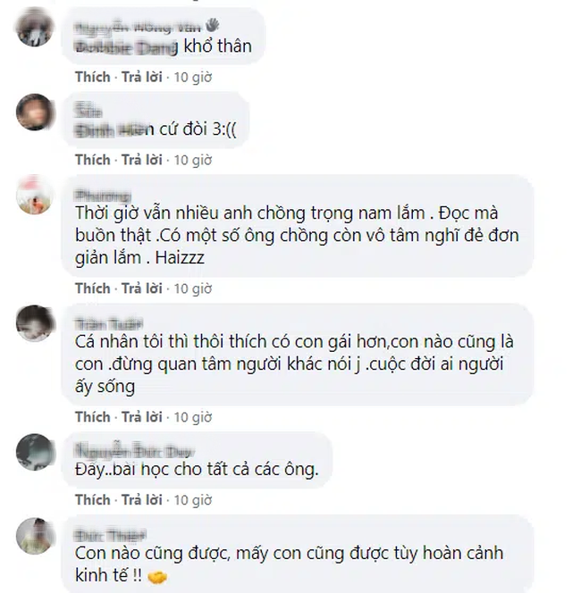 Số khác thì cầu mong cho người chồng nhiều sức khoẻ để có thể chăm sóc 3 em bé thật tốt. Đồng thời mong muốn, qua những dòng tâm sự này, những người có tư tưởng "trọng nam khinh nữ", cố đẻ cho được 1 mụn con trai nên suy nghĩ thấu đáo hơn để không còn gia đình nào phải trải qua những câu chuyện xót xa đến thế!