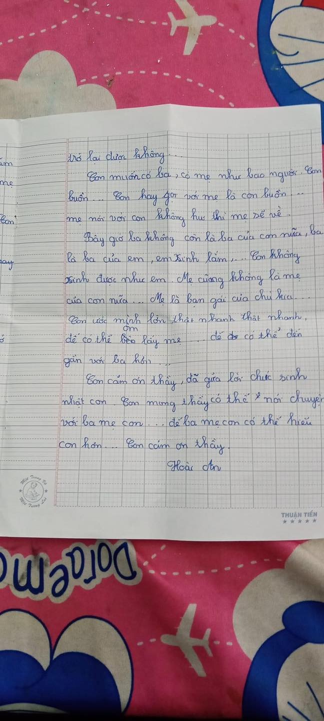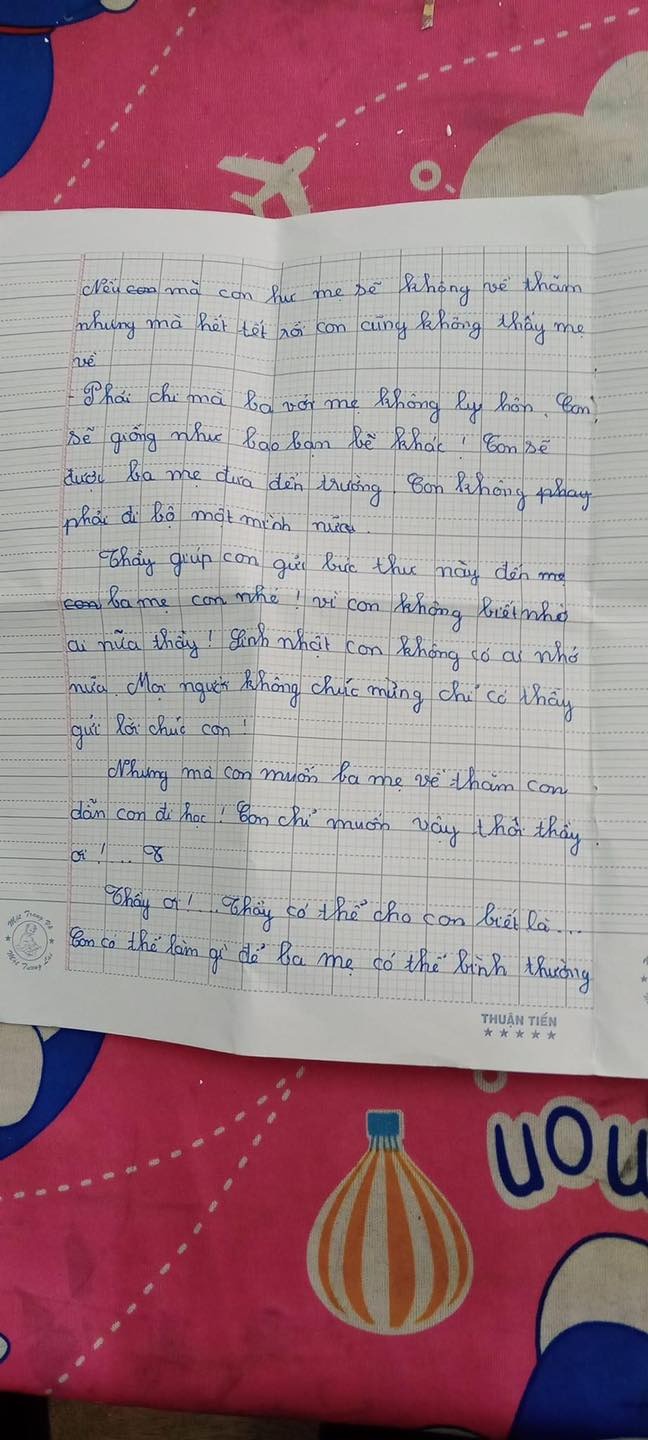 Thầy giúp con gửi bức thư này đến ba mẹ con nhé, vì con không biết nhờ ai nữa thầy! Sinh nhật con không có ai nhớ nữa, mọi người không chúc mừng chỉ có thầy gửi lời chúc con! Nhưng mà con muốn ba mẹ về thăm con dẫn con đi học, con chủ muốn vậy thôi thầy ơi!