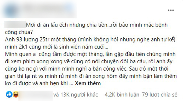 "Mời đi ăn lẩu ếch nhưng chia tiền rồi bảo mình mắc bệnh công chúa? Anh 93 lương 25 triệu một tháng (mình không hỏi nhưng nghe anh tự kể) mình 2k1 cũng mới là sinh viên năm cuối.
