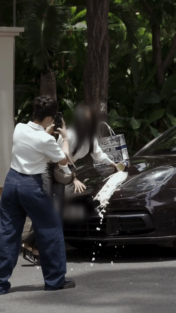 Trong khi đang tạo dáng, một cô gái đã vô tình làm đổ trà sữa lên nắp capo! Thay vì lau dọn hậu quả, cô ấy lại xách túi kéo bạn bỏ chạy mất. Nhìn cốc nước đổ nhem nhuốc ra xe và dưới đường, dân mạng bức xúc lên án hành động xấu xí của 2 cô gái.