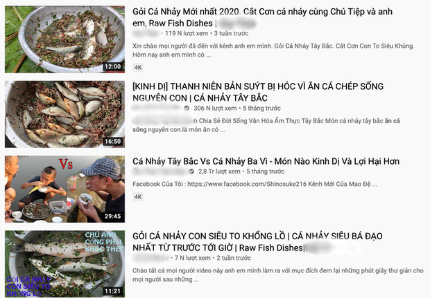Đơn cử như gần đây trên YouTube, chỉ cần tìm kiếm từ khoá "ăn cá sống", hàng tá các video từ vài chục nghìn đến cả triệu view đều hiện ra. Chủ của các kênh YouTube này cũng cố tình lựa chọn các hình ảnh gây sốc, ăn tươi nuốt sống đặt trên thumbnail để kéo người xem. Đây chắc chắn là hành vi vô cùng phản cảm!