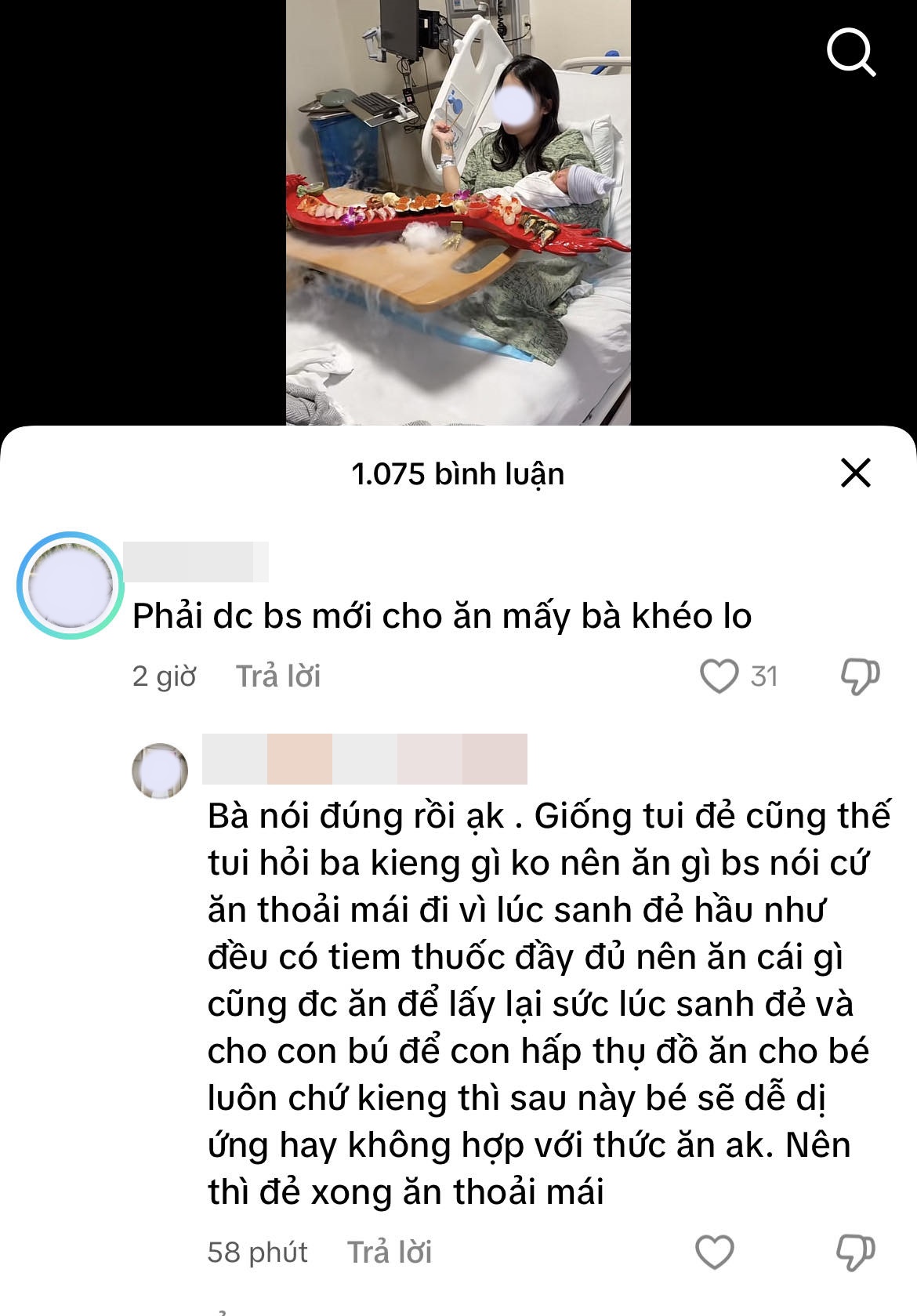 Đa số ý kiến đều tỏ ra ngạc nhiên với lựa chọn của mẹ trẻ trong clip triệu view trên, bởi họ chưa thấy ai ăn bữa cơm cữ đầu tiên là sushi cả. Theo quan niệm truyền thống của người Việt thì các món như cháo, sữa, canh rau ngót thịt nạc... mới là đồ lành tính tốt cho sản phụ sau sinh. Thế nên việc ăn đồ sống ngay trên giường bệnh viện là một hành động gây sốc cho cộng đồng các mẹ bỉm sữa, trái ngược với những gì mà họ biết về chuyện ở cữ.