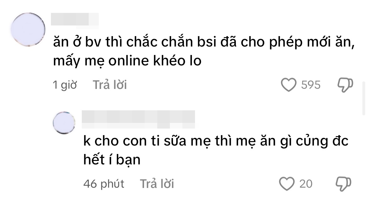 Nhiều bình luận tỏ thái độ phản đối gay gắt, chỉ trích mẹ bỉm này vì ăn uống tùy tiện, không tốt cho sức khỏe, ảnh hưởng đến sữa cho con bú... Thậm chí một bộ phận dân mạng nghi ngờ bà mẹ trẻ cố ý dàn dựng video "phông bạt" để gây tranh cãi, thu hút sự chú ý. Tuy nhiên chính chủ video không lên tiếng một lời nào cả, im lặng hoàn toàn trước làn sóng bình luận ồ ạt từ cộng đồng mạng.