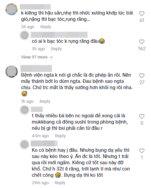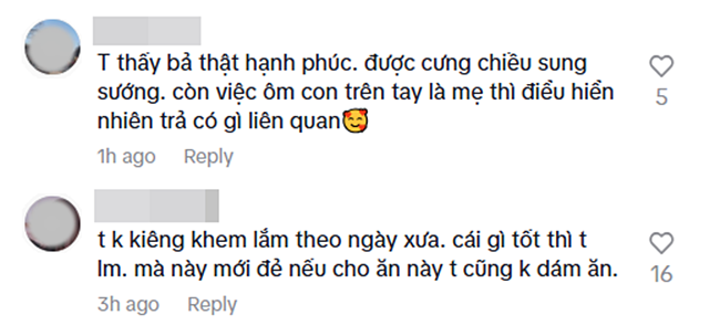 Màn mukbang độc lạ này đã nhanh chóng "châm ngòi" cho cuộc tranh cãi không ngừng nghỉ của các cư dân mạng. Đặc biệt là hội chị em bỉm sữa - những người từng đi đẻ giống sản phụ trong video, nhiều người cho rằng bữa ăn này không phù hợp với việc ở cữ, và họ khuyên bà mẹ trẻ nên kiêng ăn đồ sống ngay khi vừa đẻ xong.