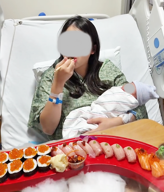 Tuy nhiên chính chủ video đã viết trên trang cá nhân rằng cô nhịn sushi suốt 9 tháng mang bầu rồi, nên đẻ xong là cô muốn nếm ngay hương vị món ăn mình yêu thích.