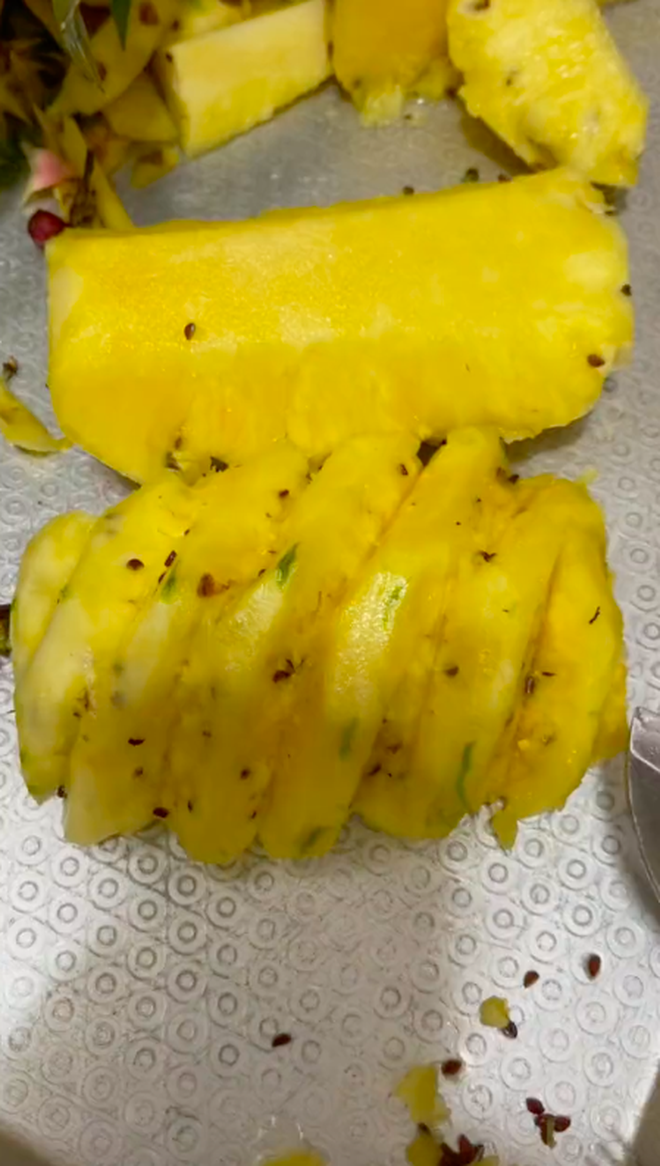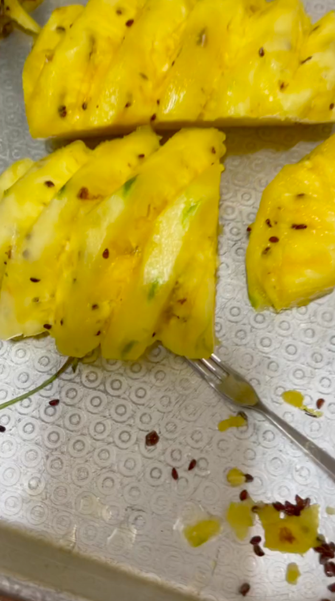 Hí hửng mua được dứa, cô nàng gọt ra thì mới thấy sai sai: “Ăn dứa mà ngỡ như đang ăn thanh long vậy, nhặt hạt đến nản luôn”.