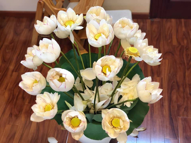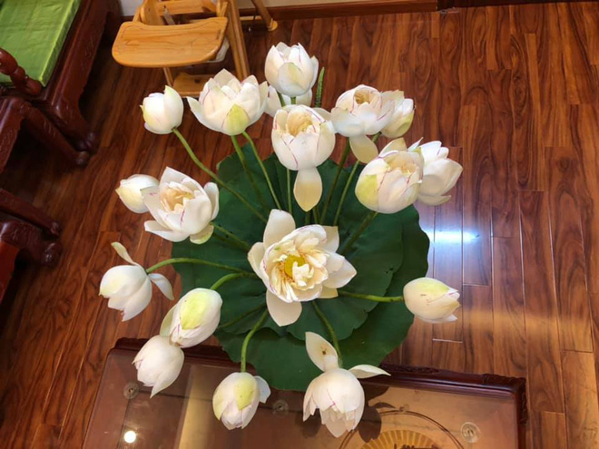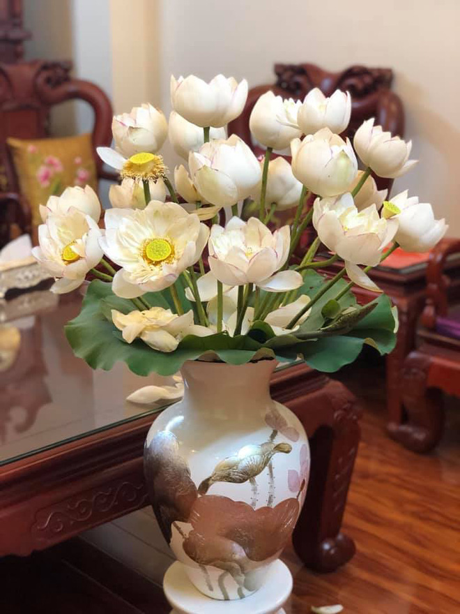 Mới đây, một bà mẹ đăng tải lên mạng xã hội bức ảnh bình hoa sen trắng rất đẹp. Chị tự mua hoa sen về nhà, dùng lá sen để làm nền, tỉ mỉ cắm một bình tuyệt đẹp. Ai nhìn vào cũng không khỏi xuýt xoa khen ngợi.