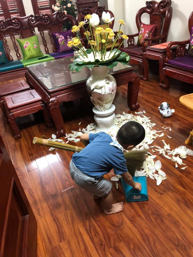 Theo đó, cậu con trai khoảng 3 tuổi đã vặt hết cánh hoa, để trơ lại nhụy hoa và đài sen thôi. Cả bình chỉ còn sót lại hai bông thoát khỏi sự "tàn sát" của cậu bé nghịch ngợm.