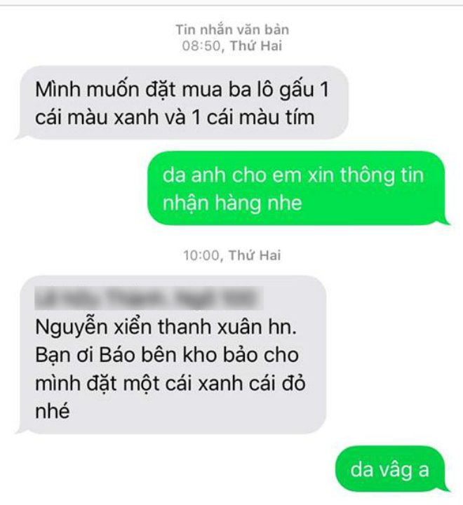 Cụ thể, người đàn ông sinh sống tại Hà Nội đặt 2 balo gấu trên một ứng dụng mua hàng. Sau đó, người này nhắn riêng cho chủ cửa hàng nói muốn đổi màu và được chấp nhận.