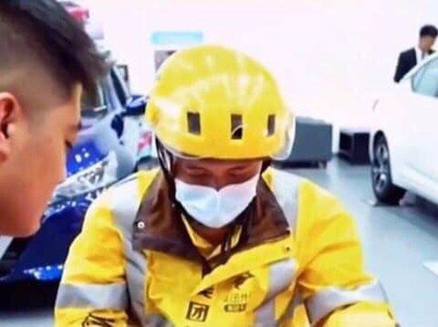Theo CCTV cửa hàng ghi lại, nhân viên của cửa hàng bán xe đã đặt đồ ăn và có một anh shipper áo vàng mang đồ đến. Trong khi đang trả tiền, nhân viên thấy anh shipper này cứ đắm đuối nhìn chiếc siêu xe bên cạnh ngay trong showroom trưng bày ô tô.