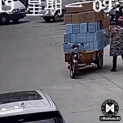 Khi người đàn ông quăng dây qua bên kia để chuẩn bị buộc hàng lại thì chiếc móc sắt của dây ràng cuốn vào một chiếc xe đạp điện đang chạy tới. Chuyện gì đến sẽ đến, chiếc móc móc vào bánh xe và khiến cho chiếc xe bị lật còn người phụ nữ cầm lái thì té đập bàn tọa xuống đường và có vẻ như vẫn chưa thể ngồi dậy được.