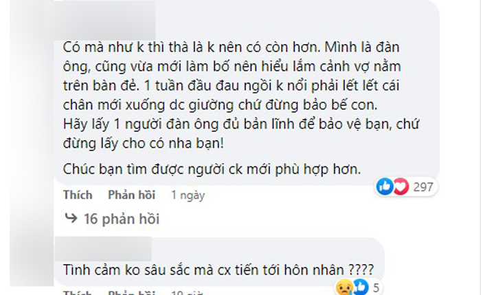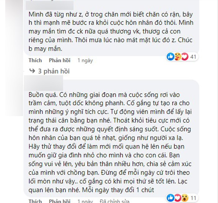 Không ít người phụ nữ kết hôn, sinh con xong gặp phải hoàn cảnh tương tự, nên bài viết của người vợ trẻ này đã nhận được rất nhiều đồng cảm. Có lẽ ngay từ đầu sự lựa chọn của chị đã là tạm bợ, nên mới dẫn đến kết quả hôm nay. Tuy nhiên cuộc đời phía trước còn rất dài, con người không thể mãi sống cam chịu và nhẫn nhịn cầu toàn như thế. Chị còn trẻ, chị còn cơ hội thay đổi, cải biến, thậm chí là "chọn lại" nếu như chị đủ mạnh mẽ và quyết tâm.