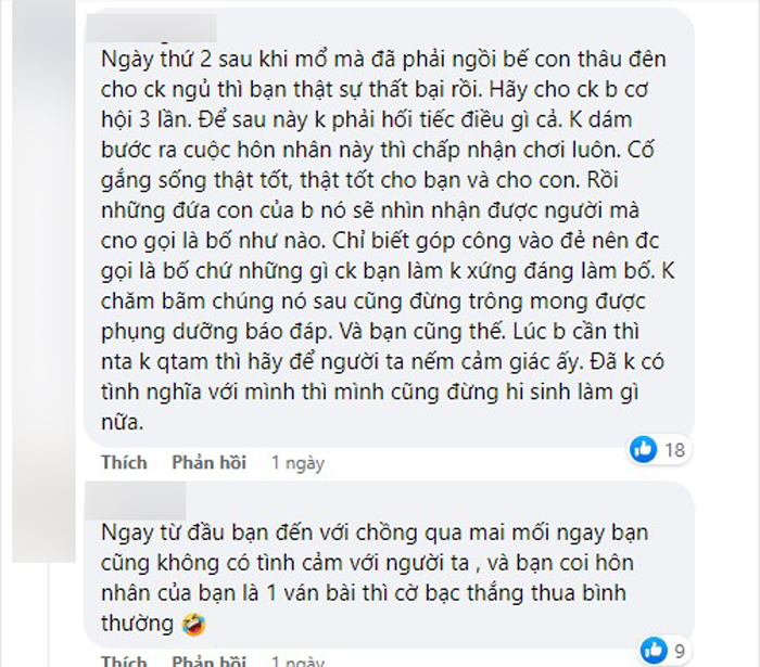 Mọi thứ sẽ vẫn ổn cho đến khi mình sinh con. Không có ai giúp đỡ, mình và chồng phải tự lo mọi thứ. Phụ nữ lúc sinh nở mới biết, lấy một người yêu mình và quan tâm mình quan trọng đến thế nào. Mình sinh mổ, vết mổ thật sự rất đau, nhưng ngày thứ 2 mình đã phải kê gối ngồi ôm con suốt một đêm dài vì con khóc còn chồng mình ngủ say bên cạnh. Sinh con, mình không ở cữ ngày nào, làm được gì mình đều làm hết. Mình đã bật khóc không biết bao lần, khi chồng con ngủ say, còn mình mới bắt đầu lo liệu cho bản thân, thu dọn nhà cửa. Đôi khi vết mổ đau quá, mình than thở đôi câu, chồng trả lời vài câu vu vơ rồi thôi. Là một người mẹ, mình không sợ vất vả, nhưng là một người vợ, mình thấy cô đơn quá. Nếu người đàn ông yêu, điều gì họ cũng có thể làm được. Khi họ không yêu mình, họ lại đổ rằng do tính cách họ vô tâm. Có lẽ ván bài này mình thua mất rồi!"
