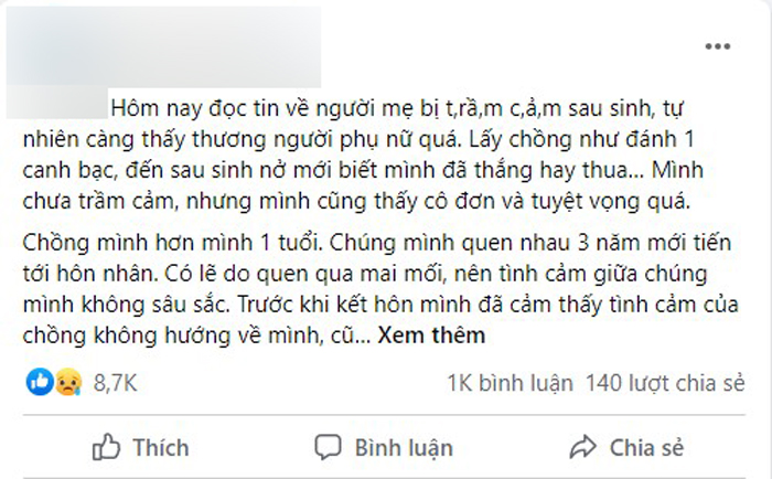"Hôm nay đọc tin về người mẹ bị trầm cảm sau sinh, tự nhiên càng thấy thương phụ nữ quá. Lấy chồng như đánh 1 canh bạc, đến sau sinh nở mới biết mình đã thắng hay thua… Mình chưa trầm cảm, nhưng mình cũng thấy cô đơn và tuyệt vọng quá!