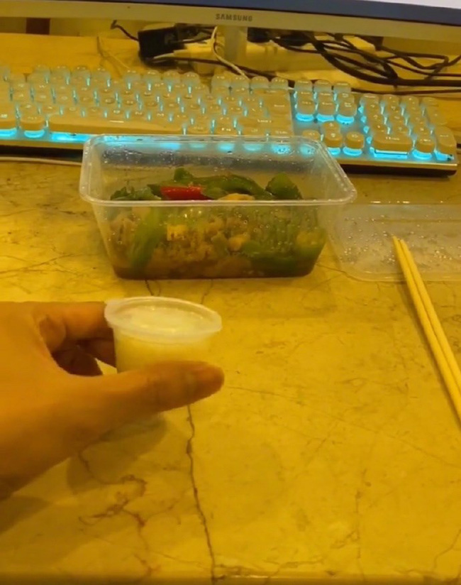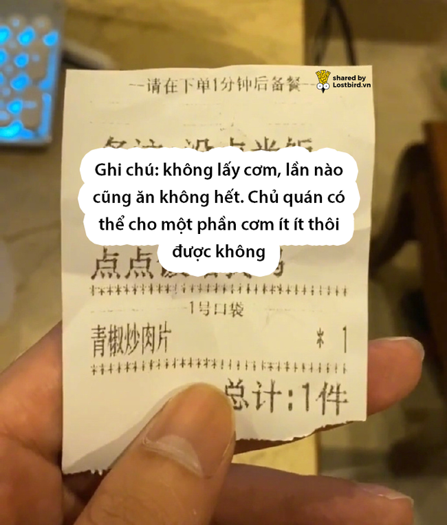 Lời ghi chú của anh chàng có vẻ hơi mâu thuẫn, trên thì bảo "không lấy cơm đâu", dưới thì lại "cho một phần cơm ít ít thôi". Nhưng dù thế, có vẻ ý của thanh niên này vẫn là cho 1 phần ít cơm hơn bình thường.