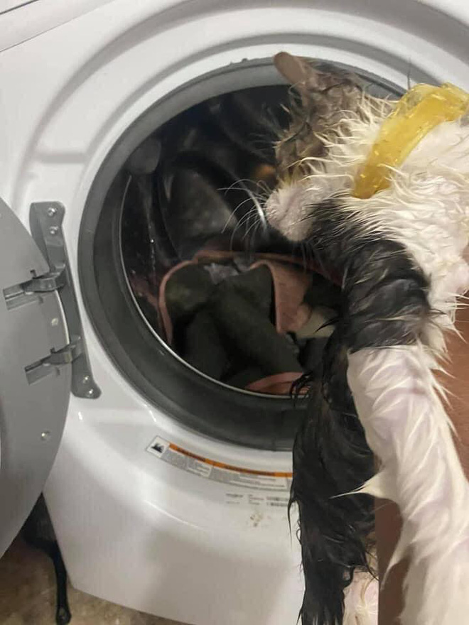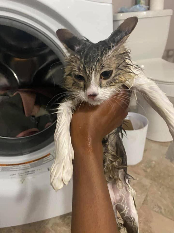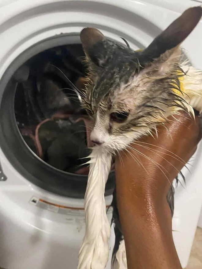 Câu chuyện mang tính cảnh tỉnh trên đây là do chủ nhân của con mèo ướt như chuột lột vừa được lôi ra từ máy giặt trong ảnh. Chẳng là trong lúc giặt quần áo, cô dừng lại trước máy giặt và hoảng hồn phát hiện con mèo của mình đang ở trong đó.
