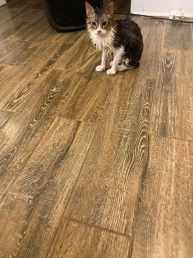 "Boss" nghịch ngợm quá cũng khiến "sen" được một phen hú vía. Khi được đưa ra ngoài, chú ướt đẫm toàn thân, lông bết lại thật tội nghiệp làm sao. Đúng là chỉ vì nghịch ngợm, không chú ý mà con mèo suýt nó gặp nguy hiểm tính mạng thật sự.