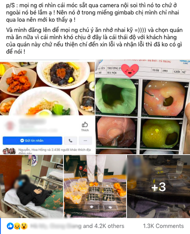 Mới đây, vụ việc xảy ra tại một quán ăn Hàn Quốc ở Hà Nội đang khiến dân mạng xôn xao. Một cư dân mạng với tài khoản Facebook T.H.H. đăng đàn trong hội nhóm review “tố” món gimbap ở quán ăn này có móc sắt, đã mắc vào dạ dày của chị gái H. khi dùng bữa từ cuối tháng 2/2021. Lập tức, bài tố đã khiến cư dân mạng tranh cãi sôi nổi.
