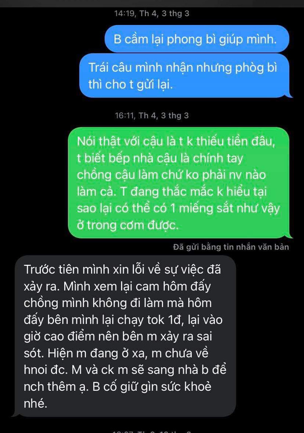 Theo đó, gia đình H. order một loạt món từ quán vào ngày 27/2, sau bữa tối chị gái H. phải nhập viện vì đau bụng, kết quả nội soi cho thấy một mảnh móc sắt móc trong dạ dày. Khi liên lạc với quán, đại diện quán tới nhà H. chỉ đưa 2 triệu và không nói lời xin lỗi. H. không hài lòng với cách xử lý, muốn gửi lại tiền thì quán mới xin lỗi. Tuy nhiên, sau đó phía quán có thái độ lảng tránh, H. đã chuyển khoản trực tiếp lại số tiền đền bù.