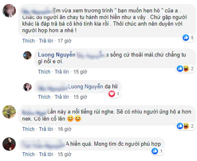 - Em vừa xem trương trình 'Bạn muốn hẹn hò' của anh. Chắc do người ăn chay tu tập mới hiền như anh vậy. Chứ gặp người khác là đáp trả bà cô khó tính kia rồi. Thôi chúc anh nên duyên với người hợp hơn anh nhé!