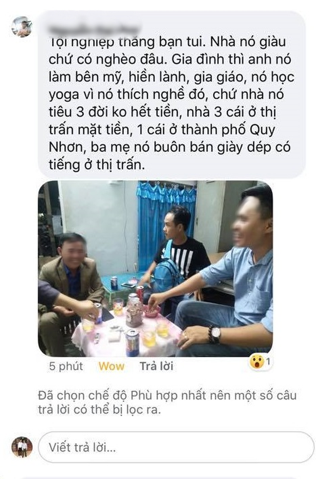 Điều thú vị vẫn chưa dừng lại ở đó, một tài khoản facebook tự xưng là bạn của Hoàng Nguyễn sau đó đã đăng kèm những thông tin khiến cộng đồng mạng phải "mắt tròn mắt dẹt: "Tội nghiệp thằng bạn tôi, nhà nó giàu chứ có nghèo đâu. Gia đình thì anh nó làm bên Mỹ, hiền lành, gia giáo. Nó học Yoga vì thích nghề đó chứ nhà nó tiêu 3 đời không hết tiền. Nhà 3 cái ở thị trấn mặt tiền, 1 cái ở Quy Nhơn, ba mẹ nó buôn bán giày dép có tiếng ở thị trấn".
